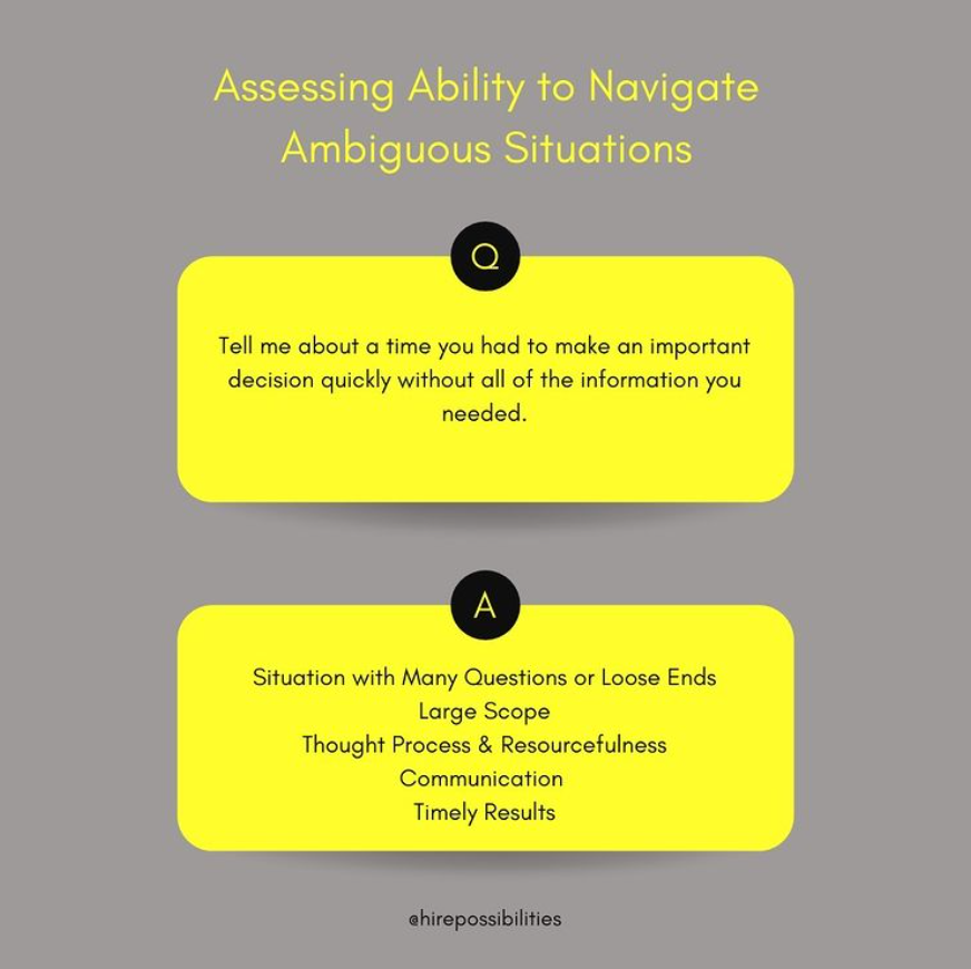 If a new hire is stepping into a role that is undefined or won't have a lot of support, they may be asked interview questions about navigating ambiguous situations. This can be tricky to assess in an interview, but asking for an example of a time they had to act quickly without much information to make an important decision is a good place to start. For hiring managers, this can also directly inform ramp up plans for new hires, making plans for specific areas of coaching you're able to identify from their answer to this question.