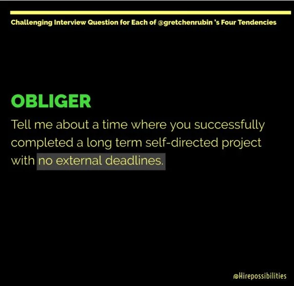 Obliger is another common tendency of @gretchenrubin 's Four Tendencies framework. They often have a hard time staying on track without external accountability, so this may be a difficult question for them to come up with a noteworthy answer for. As an obliger, practice developing and using structure even in personal projects to stay on track and exceed your goals.