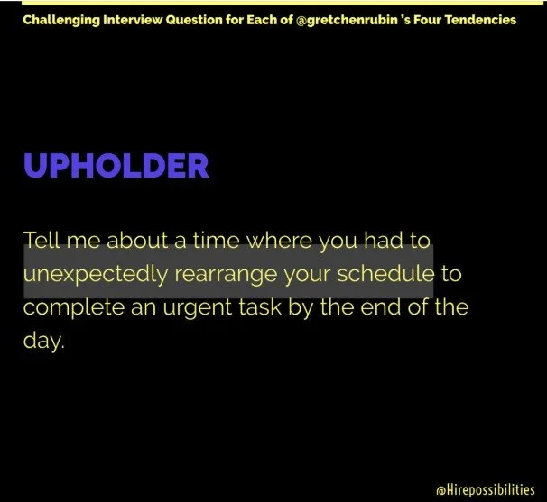 If a candidate has a harder time answering this question in an interview, it may mean they are more junior and have less experience maneuvering this way, or they like to stick to their schedule of prioritized tasks. It's great to work with an Upholder as you know they take their work and deadlines seriously, but you may need to help provide other resources if they find it hard to shift for an urgent priority.