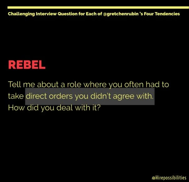 The Rebel is the type in @gretchenrubin 's Four Tendencies Framework who has a hard time conforming to both inner and outer expectations. It's tough for anyone to act on direct orders they don't agree with, but especially for a Rebel. Questioners have a hard time with this, too, which is why the questions I chose are similar. This question is getting at a pattern of following these types of direct orders rather than diving deep into one specific disagreement, as it may be easier for a rebel to feel stuck in this kind of situation rather than change the process or find another role.